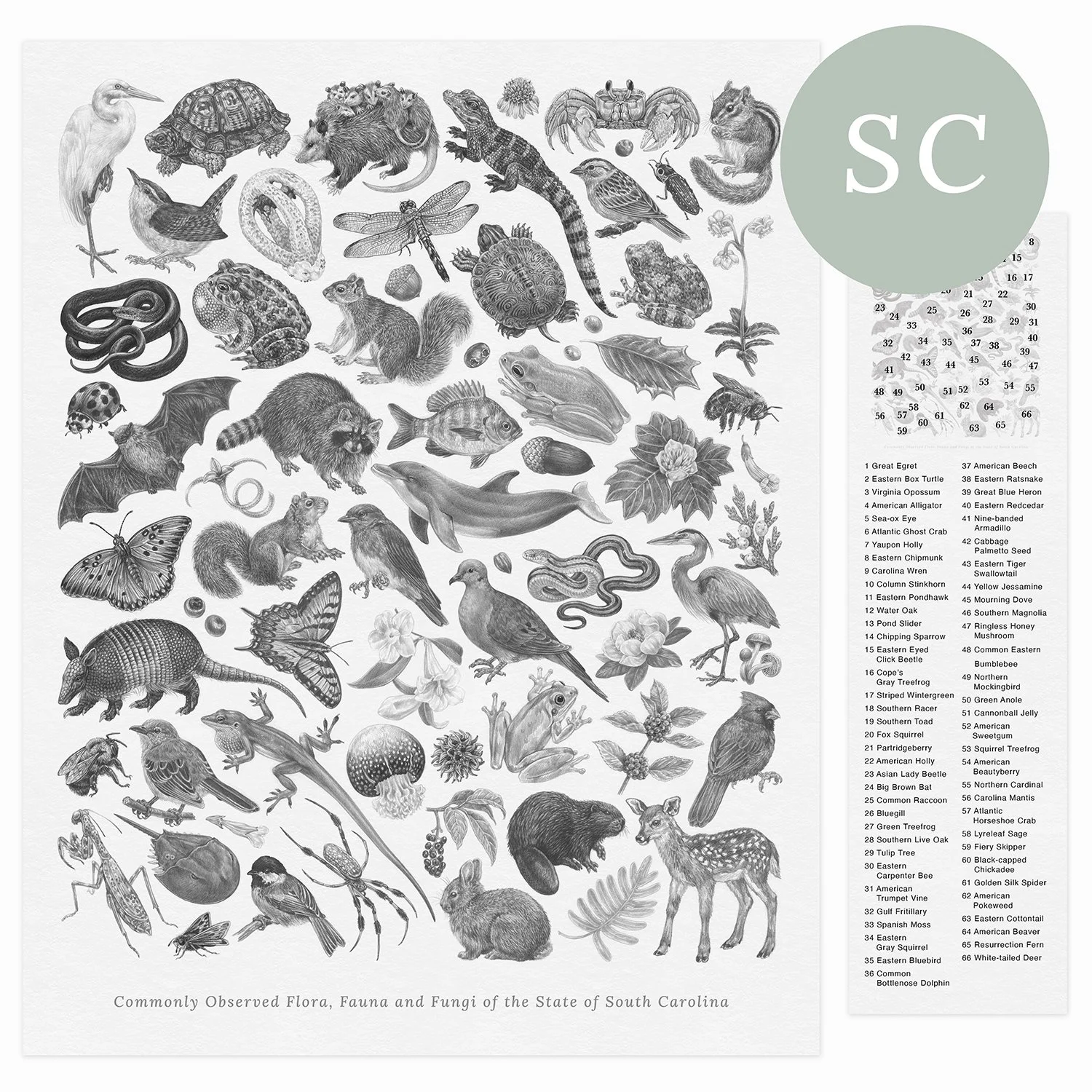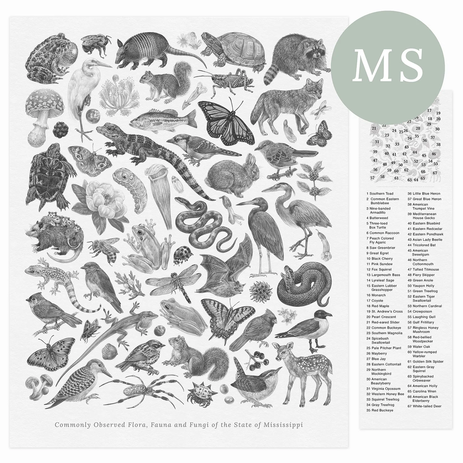 This print series highlights the unique biodiversity of each of the 50 states. Every print includes over 50 species, of flora, fauna and fungi, meticulously rendered in Zoe’s highly-detailed style. Prints are accompanied by a species key so that you can learn the name of every species in the print!